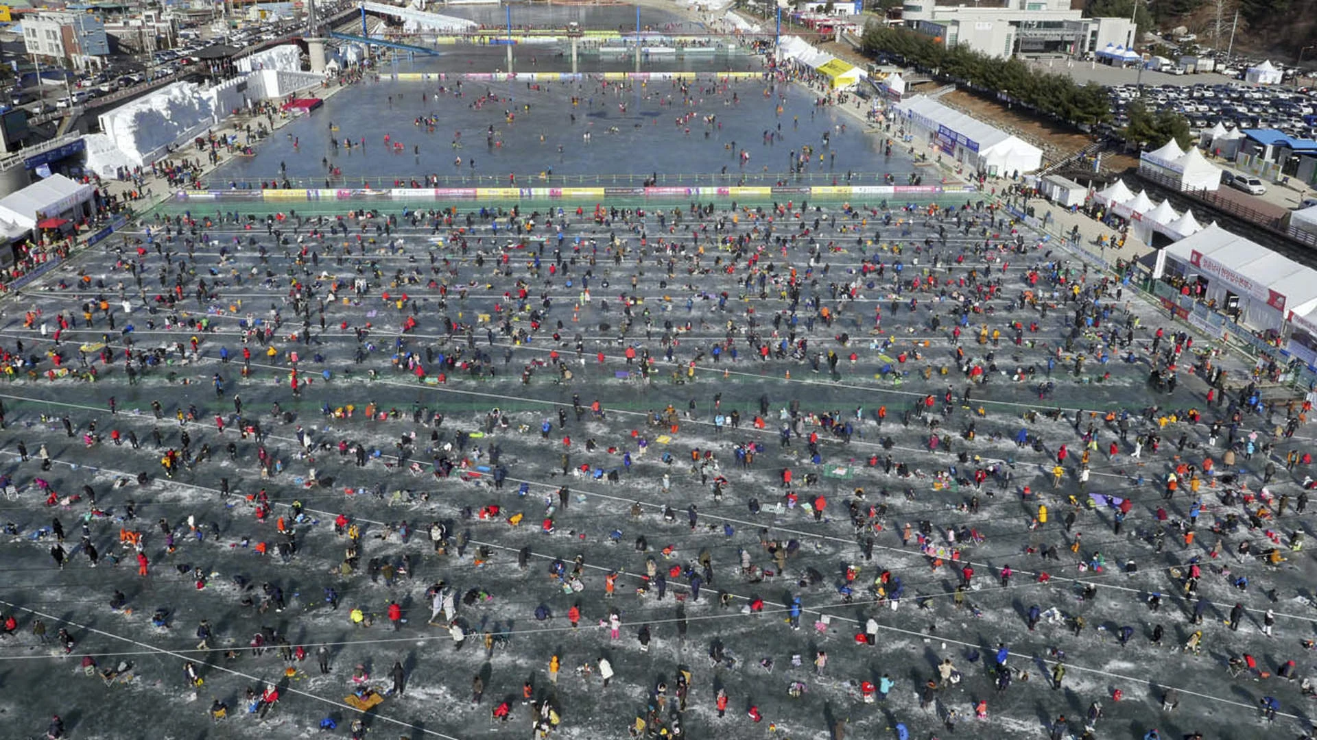 산천어 얼음낚시를 위한 1만 2천 개의 얼음구멍이 있는 화천천은 수심 2m 정도의 맑은 강이기 때문에